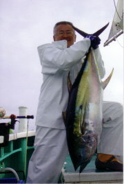 腕に抱えきれないほどのカンパチを釣り上げてご満悦な坂東親分(2006.07.xx)